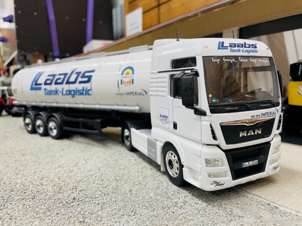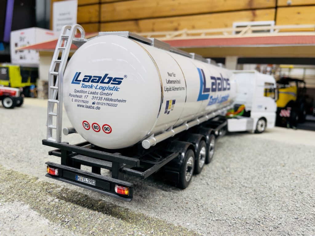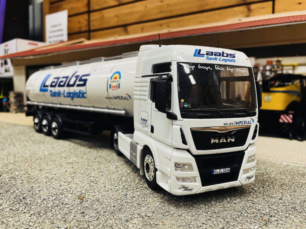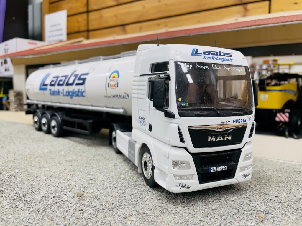 Das heutige Modell zeigt einen Zug der Laabs GmbH Spedition. Ein Unternehmen, das lange im Tank- und Lebensmittel-Bulktransport stark war und Teil größerer Logistikgruppen wurde. 2017 erfolgte der Verkauf von Imperial Logistics International an die Boettger Gruppe, inklusive der Verbindung mit der Fernlast Spedition. Gerade wegen ihrer auffälligen, wenn auch schlichten Werbung haben wir diesem Speditionszug ein eigenes Modell gewidmet. Ausgestattet mit der markanten Laabs Beklebung, den typischen Hildesheimer Kennzeichen und einigen gezielt gesetzten Anbauteilen, die dem Ganzen sichtbar Leben einhauchen. Fotografiert wurde das Modell auf Manuels Hammer Diorama. Denn die Kulisse passt einfach. Du hast selbst eine Idee oder Vision für ein Modell? Wir unterstützen dich mit individuellen Decals und einer sauberen Umsetzung. Meld dich einfach. Und wir finden eine Lösung, die passt.